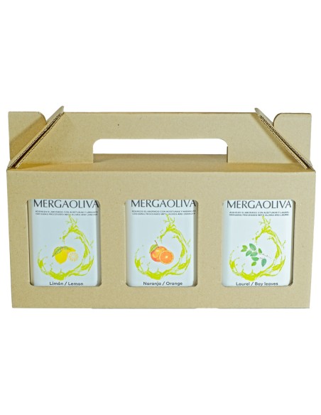A set with our current oils flavoured with lemon, orange and laurel, presented in a simple "ecological" cardboard box.
