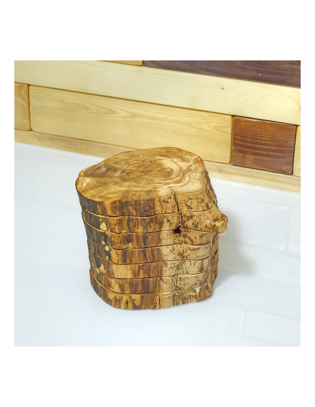 We offer this set of 6 slices made of olive wood. The lower piece is a support with a guide-axis, to prevent the pieces from sliding once they have been placed one on top of the other.