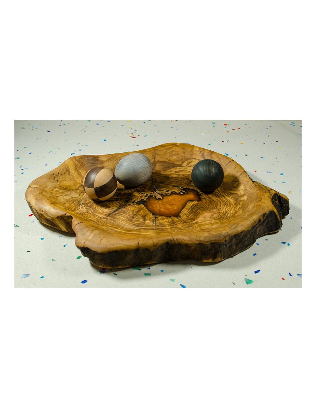 Dada la hetereogeneidad y dureza de la madera de olivo, durante su secado se forman abundantes grietas o cárcavas; la resina, en su forma líquida inicial, nos proporciona una buena solución para el sellado o relleno de esos espacios abiertos. Pero no sólo los llena de líquido, sino que también los llena de elegancia con sus colores.