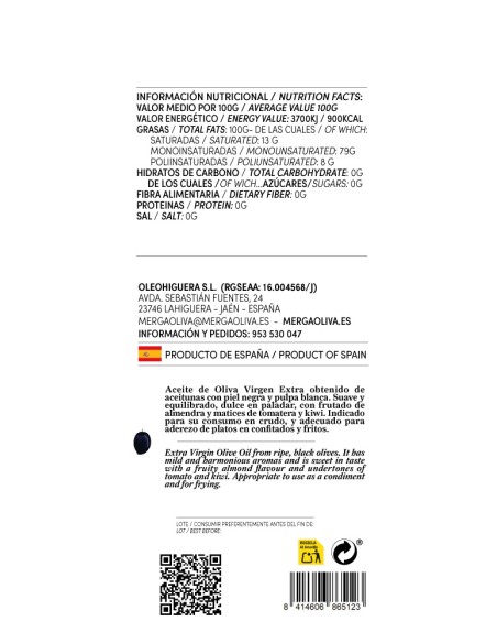 Huile d'olive vierge extra provenant d'olives à peau noire. Disponible dans la variété picual. Elle a été obtenue pendant les premiers jours de décembre, par extraction à froid, dans le moulin à huile biologique Mergaoliva.  Une exploitation familiale d'oliveraies traditionnelles située dans la province de Jaén.